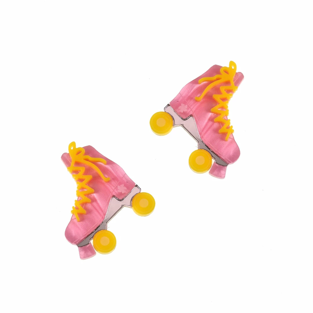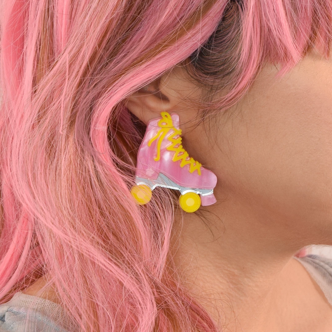 Roll with It Earrings are EXTRA LARGE inlay earrings cut from pearl pink, neon yellow and mirror silver acrylic. Roll with It Earrings are BIG yet lightweight on the earlobe. These pink and Yellow XL Rollerskate earrings are a perfect fit for roller derby gals and fans alike!