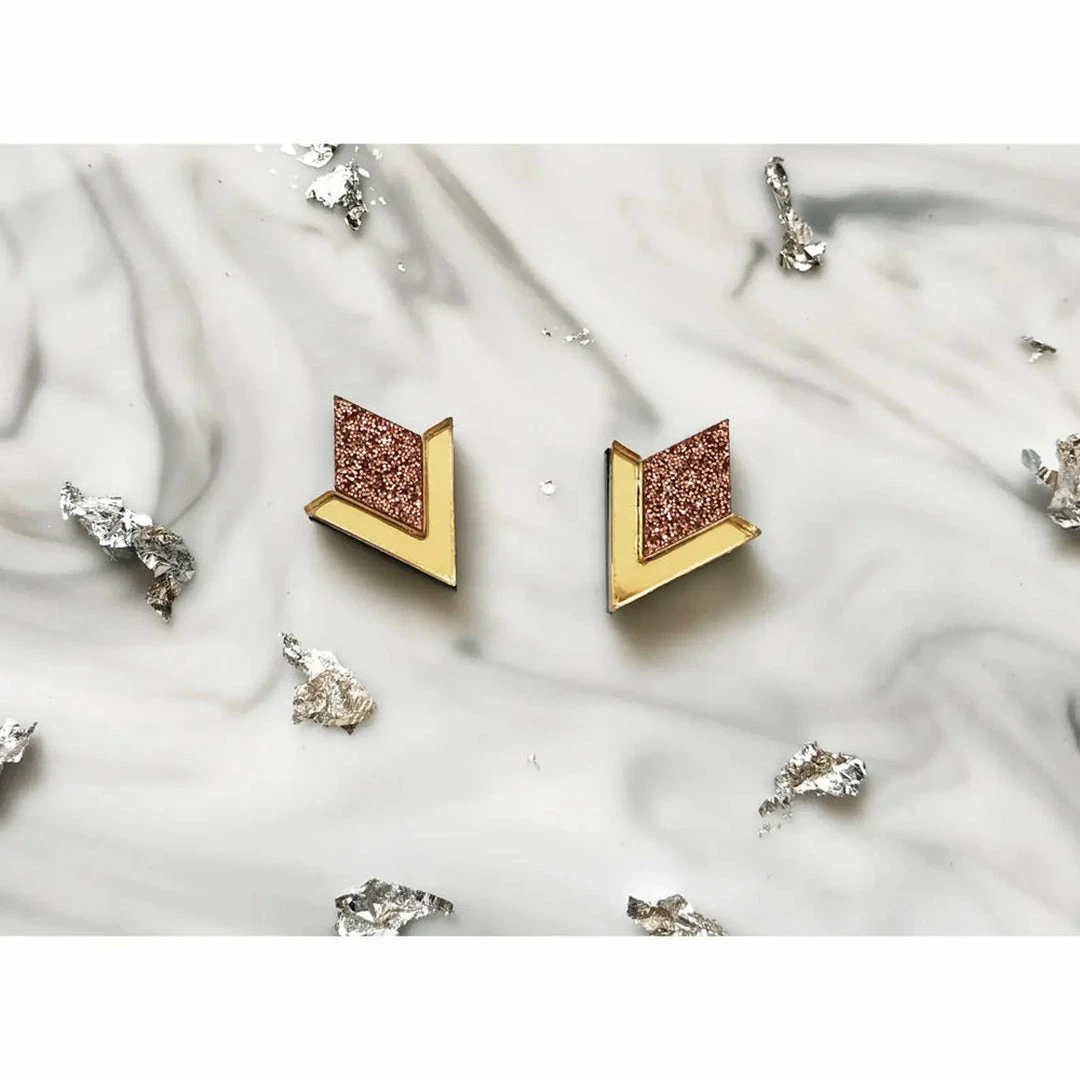 Art deco inspired studs with rose gold glitter and gold mirror details.