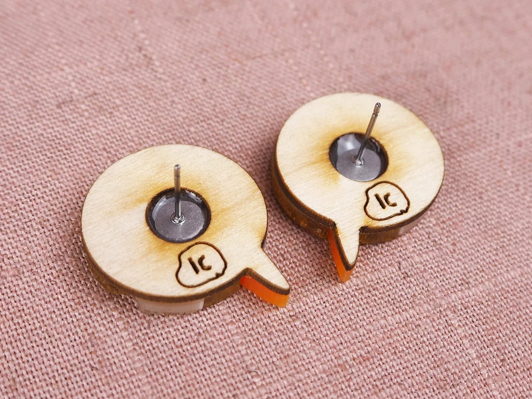 This piece is made up from illustrated maple wood with an engraved peach orange beak. Set against a mirror gold sun. The illustrated lines are defined with black and pink ink. All mounted on 1.5mm wood finished with hypoallergenic surgical steel earring posts.