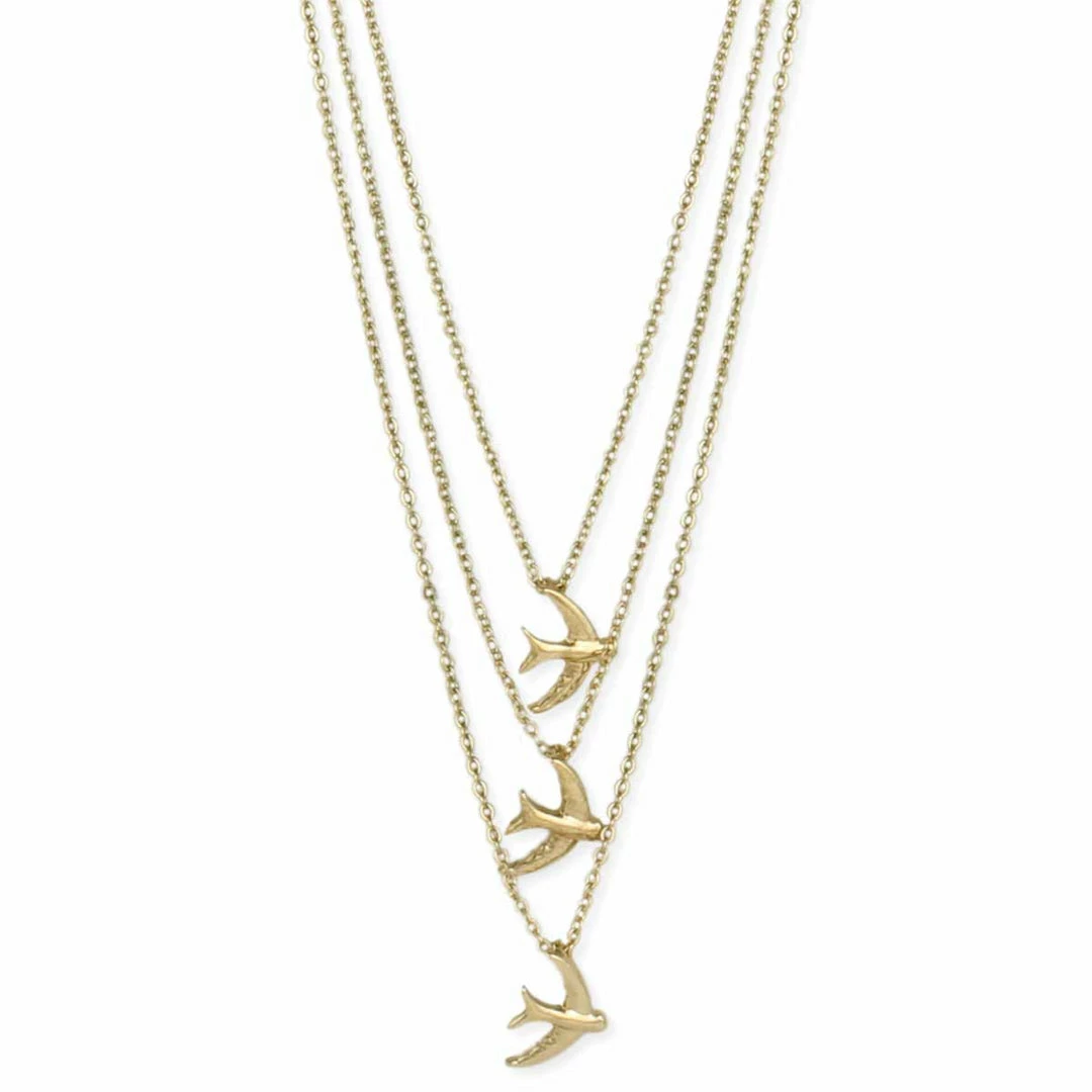 Don’t let this necklace fly by! Three graduating lines of delicate gold link chain feature a gold flying bird charm. This cute flock is flying straight into your fashion! • Three line gold bird layer necklace