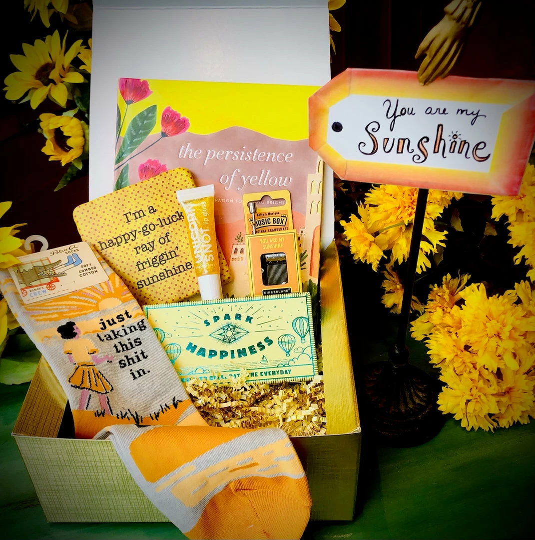 Curated boxes of happy are an easy, fun way to treat someone special! They are perfect for gifting from afar. We will tie an nice bow, etc to make it extra special!